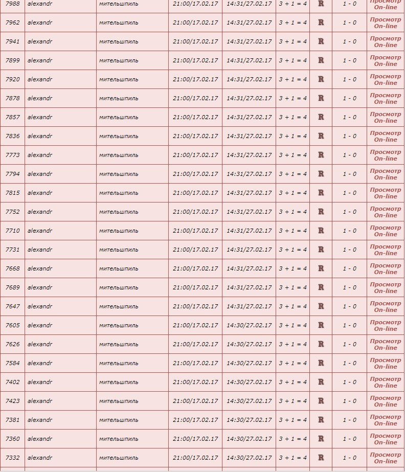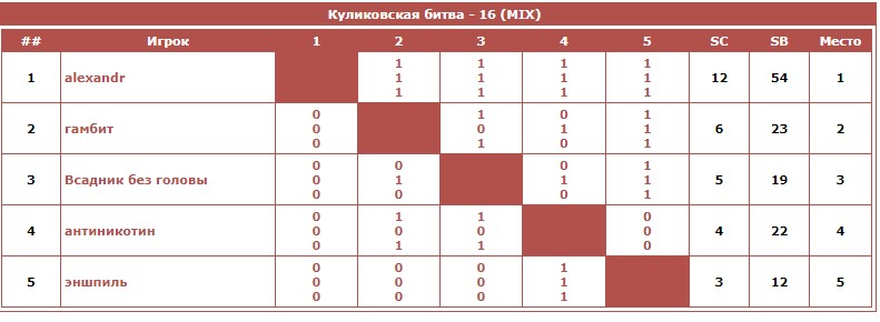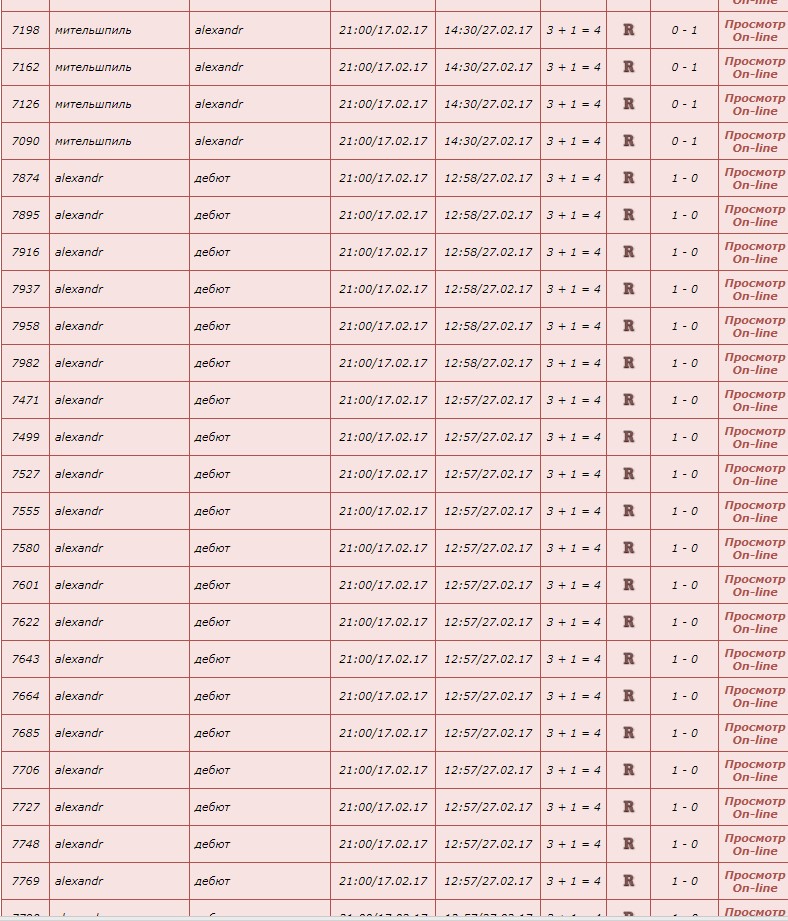 09:07-foxter:запустил на 32 участника.... и кому-то повезло с первым туром...))) 08:42-foxter:запишись обратно, я что-нить придумаю... этот с 32 запушу... 08:38-EvgenyL1406:afhf с ноября нет... я выписался.. 08:34-EvgenyL1406:Anatoli тоже редко виден в последнее время... 08:33-EvgenyL1406:WhiteBishop с октября нет на сайте... 08:32-EvgenyL1406:messii не играет... 08:31-foxter:Сашка, нужна атака твоих...))) семерых насчитаешь?)) 08:30-foxter:да, вижу, спасибо! 08:30-EvgenyL1406:Тоже... запустились оба... 08:29-foxter:блин, а в этом Чемпионат портала «Лето - 25» 25 на 16 мест... жесть..