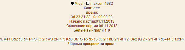 Мигель, каким цветом все же играл? Я уже заметил сам там технические несостыковки... там написано, что ты играл черными и черные просрочили время...