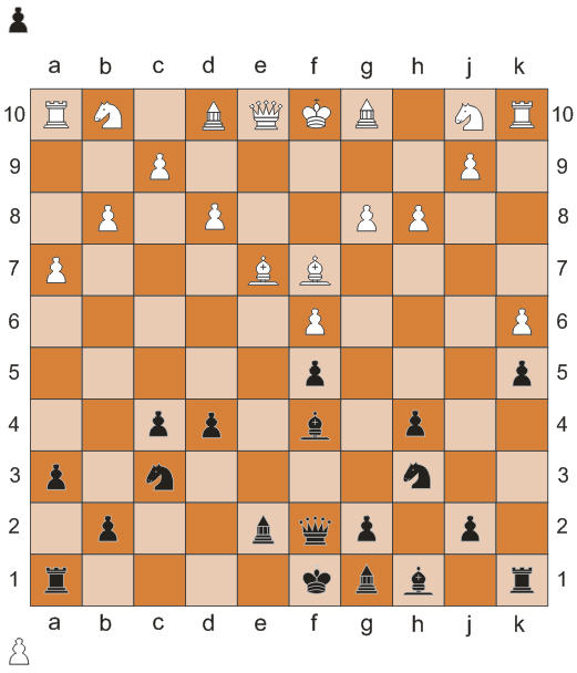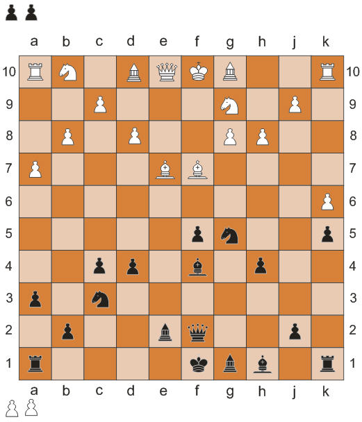 1. f2-f5; f9-f6; 2. e2-e4; g9-g8; 3. h2-h4; b9-b8; 4. Кj1-h3; k9-k6; 5. k2-k5; a9-a7; 6. d2-d4; Сh10-g9; 7. Сс1-f4; Cc10-d9; 8. с2-с4; e9-e6; 9. Фе1-f2; e6-f5; 10. е4-f5; Сd9-f7; 11. Рd1-e2; Сg9-b4; 12. а2-а3; Сb4-e7; 13. Кb1-c3; h9-h8; 14. g2-g5; f6-g5; 15. Кh3-g5; Кj10-g9; 16.
