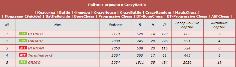 09:07-foxter:запустил на 32 участника.... и кому-то повезло с первым туром...))) 08:42-foxter:запишись обратно, я что-нить придумаю... этот с 32 запушу... 08:38-EvgenyL1406:afhf с ноября нет... я выписался.. 08:34-EvgenyL1406:Anatoli тоже редко виден в последнее время... 08:33-EvgenyL1406:WhiteBishop с октября нет на сайте... 08:32-EvgenyL1406:messii не играет... 08:31-foxter:Сашка, нужна атака твоих...))) семерых насчитаешь?)) 08:30-foxter:да, вижу, спасибо! 08:30-EvgenyL1406:Тоже... запустились оба... 08:29-foxter:блин, а в этом Чемпионат портала «Лето - 25» 25 на 16 мест... жесть..