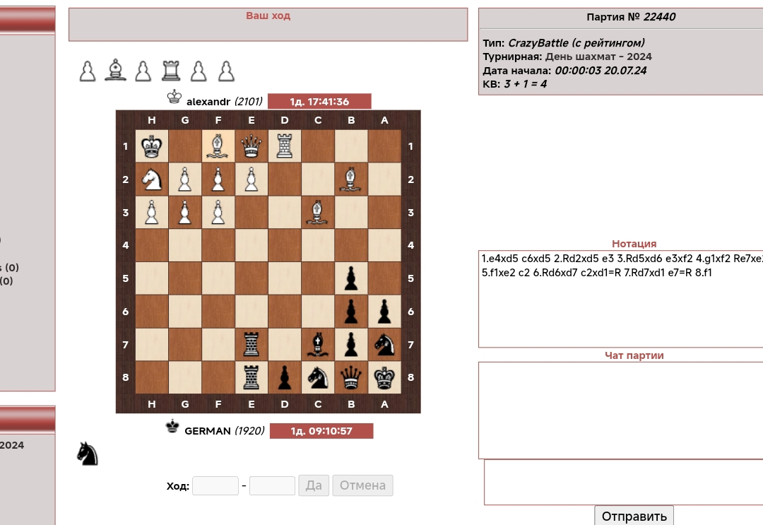 09:07-foxter:запустил на 32 участника.... и кому-то повезло с первым туром...))) 08:42-foxter:запишись обратно, я что-нить придумаю... этот с 32 запушу... 08:38-EvgenyL1406:afhf с ноября нет... я выписался.. 08:34-EvgenyL1406:Anatoli тоже редко виден в последнее время... 08:33-EvgenyL1406:WhiteBishop с октября нет на сайте... 08:32-EvgenyL1406:messii не играет... 08:31-foxter:Сашка, нужна атака твоих...))) семерых насчитаешь?)) 08:30-foxter:да, вижу, спасибо! 08:30-EvgenyL1406:Тоже... запустились оба... 08:29-foxter:блин, а в этом Чемпионат портала «Лето - 25» 25 на 16 мест... жесть..