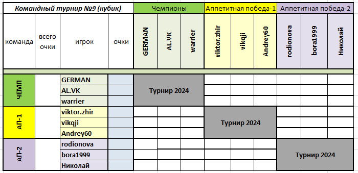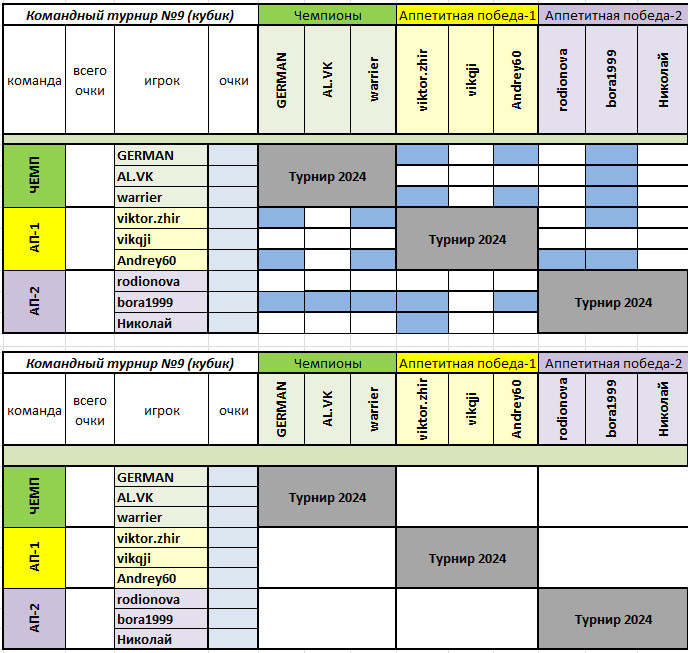 3. Состав в очередном круге может быть изменен по усмотрению капитанов;изменения в составе команд текущего круга допустимы по ходатайству капитана, производящего замену,при этом на момент замены принимаются к учету завершенные партии заменяемого игрока и создаются вызовы на оставшееся количество партий для заменяющего игрока; в таблицу вносятся Ники обоих игроков.