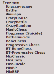 Турнир состоит из 4 партий: BattleChess, CrazyBattle, BattleBone Chess, BattleProgressive Chess.